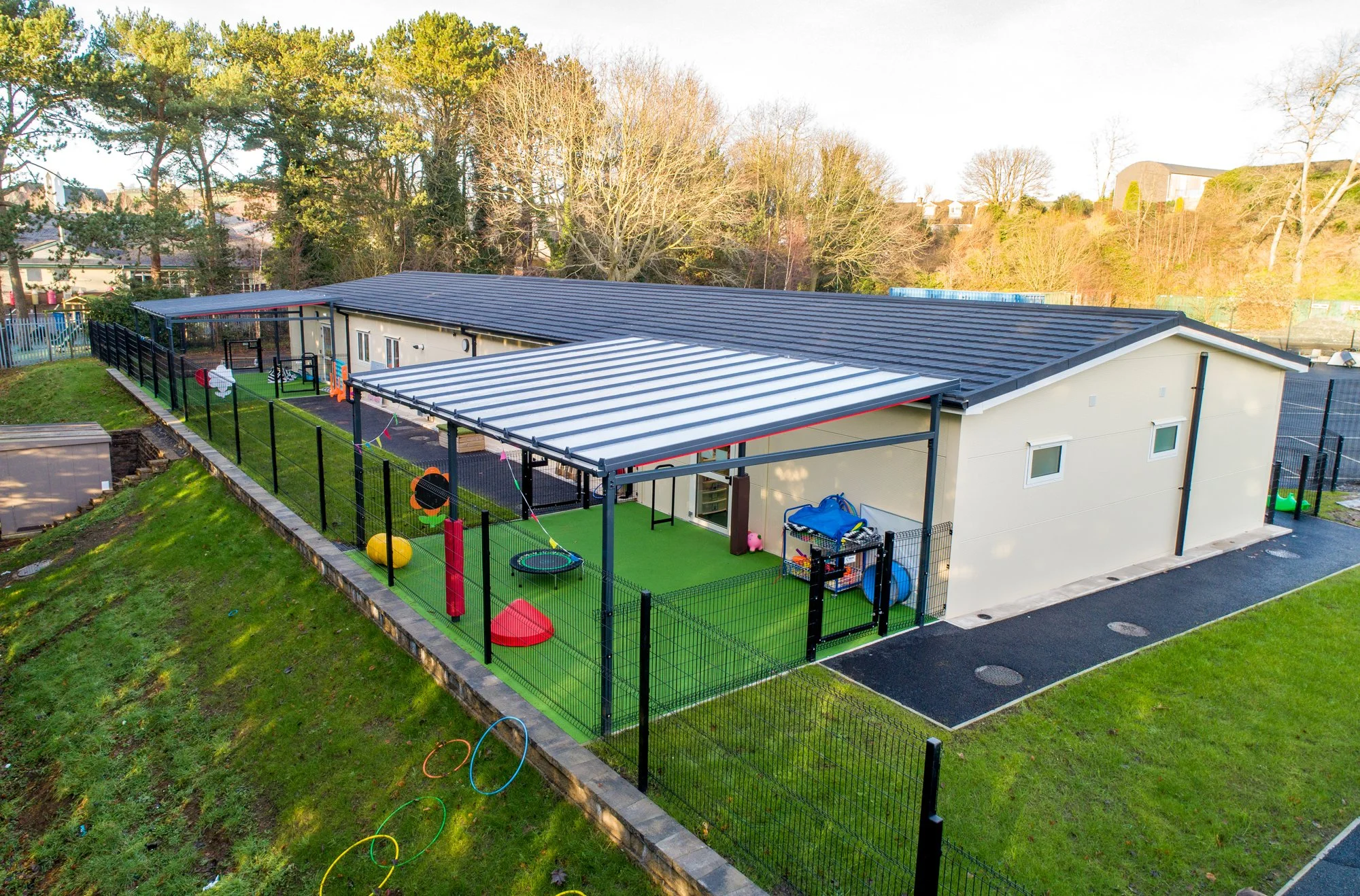 The building consists of two classrooms, two sensory rooms, two hygiene rooms, toilets and stores. Both classrooms have direct access to individual covered soft play areas which have standalone canopy structures overhead. The play areas are securely fenced and access from the classrooms is Access Controlled.